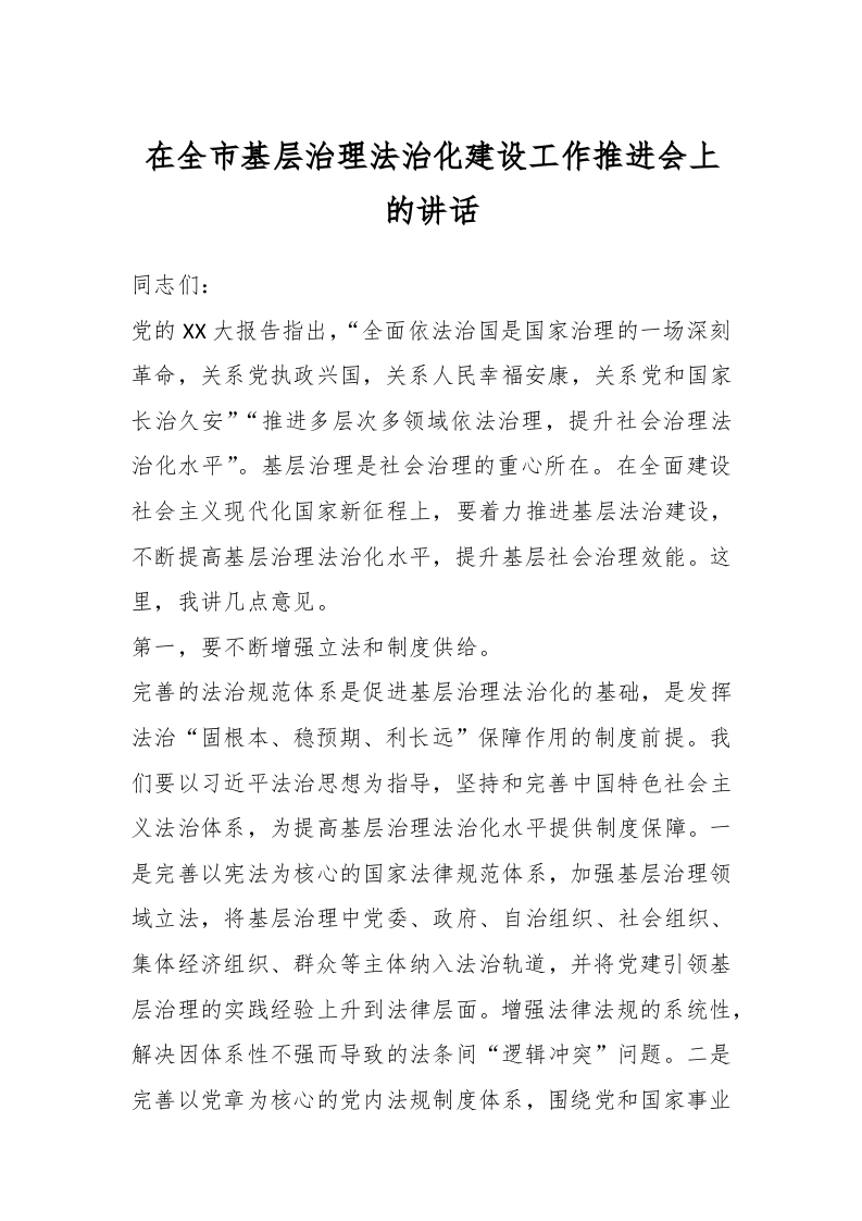 / 在全市基层治理法治化建设工作推进会上的讲话