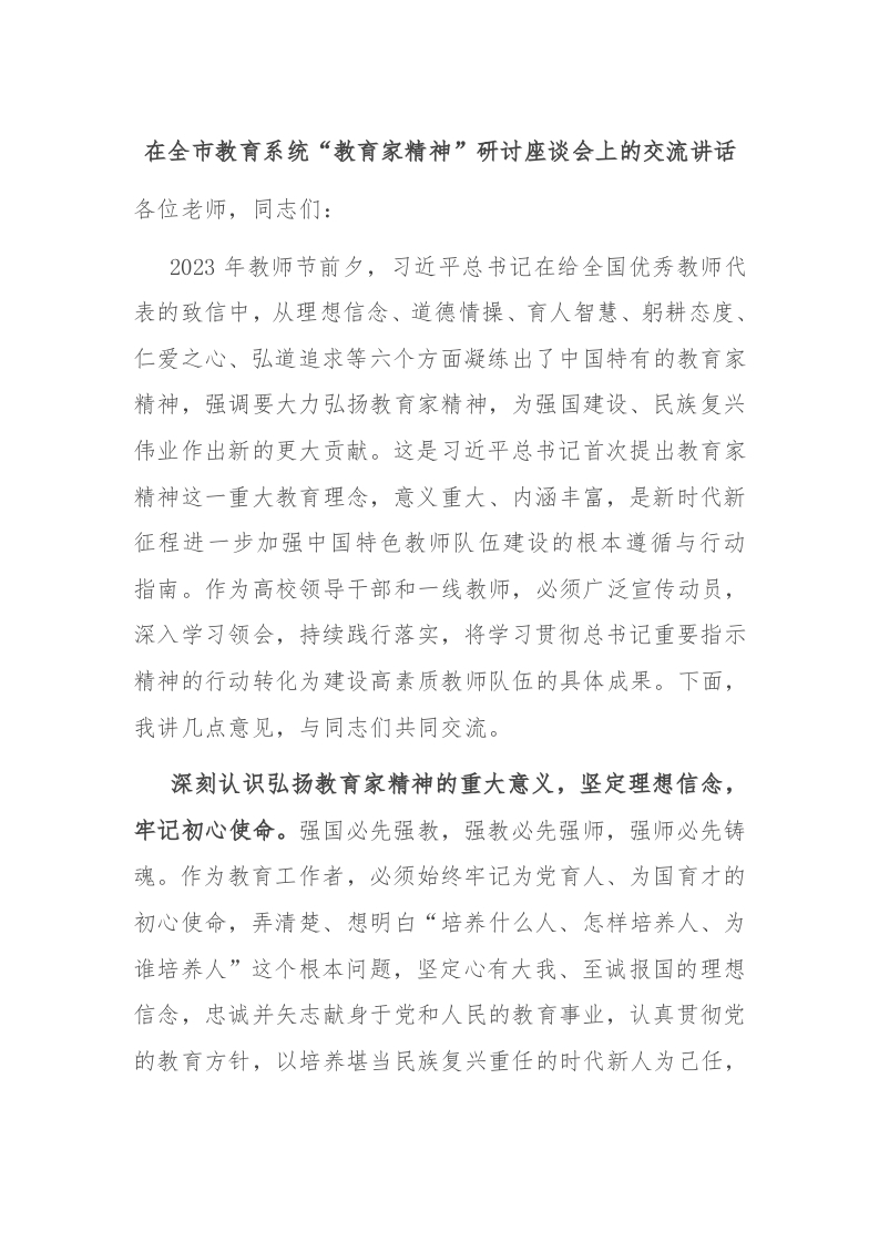 / 在全市教育系统“教育家精神”研讨座谈会上的交流讲话