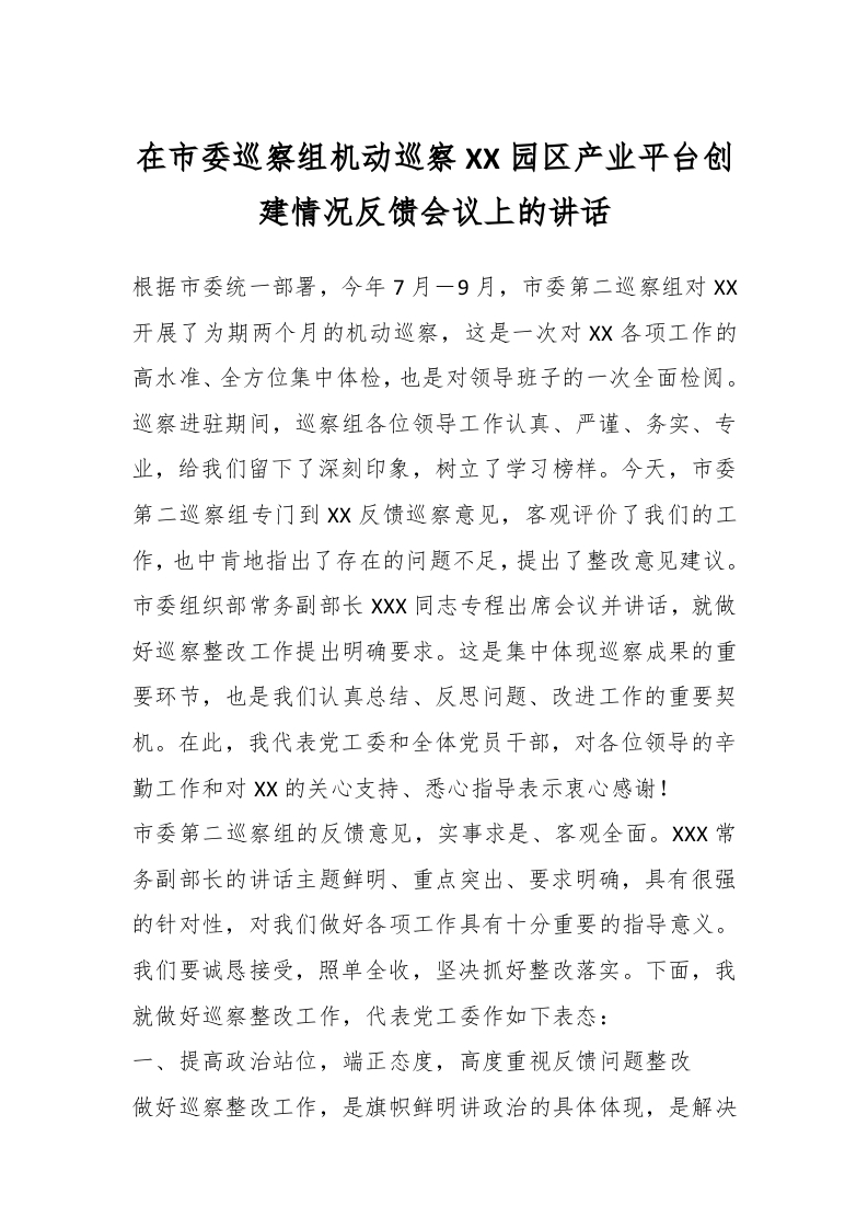 / 在市委巡察组机动巡察XX园区产业平台创建情况反馈会议上的讲话