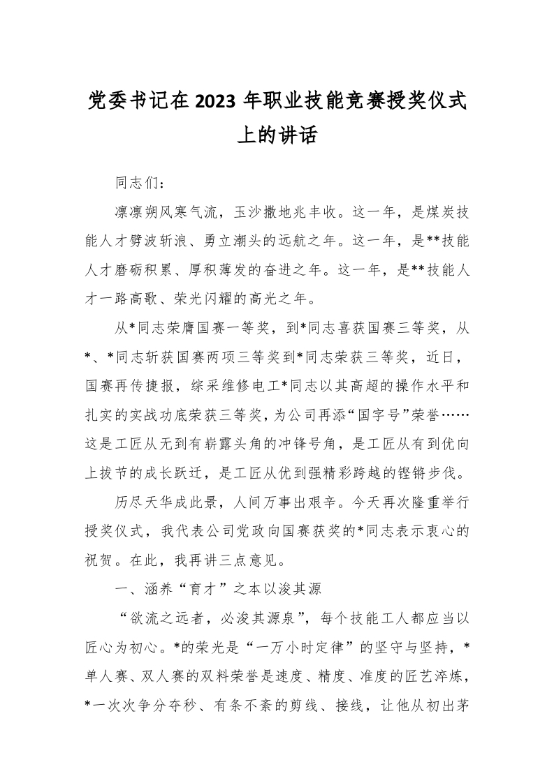 / 党委书记在2023年职业技能竞赛授奖仪式上的讲话