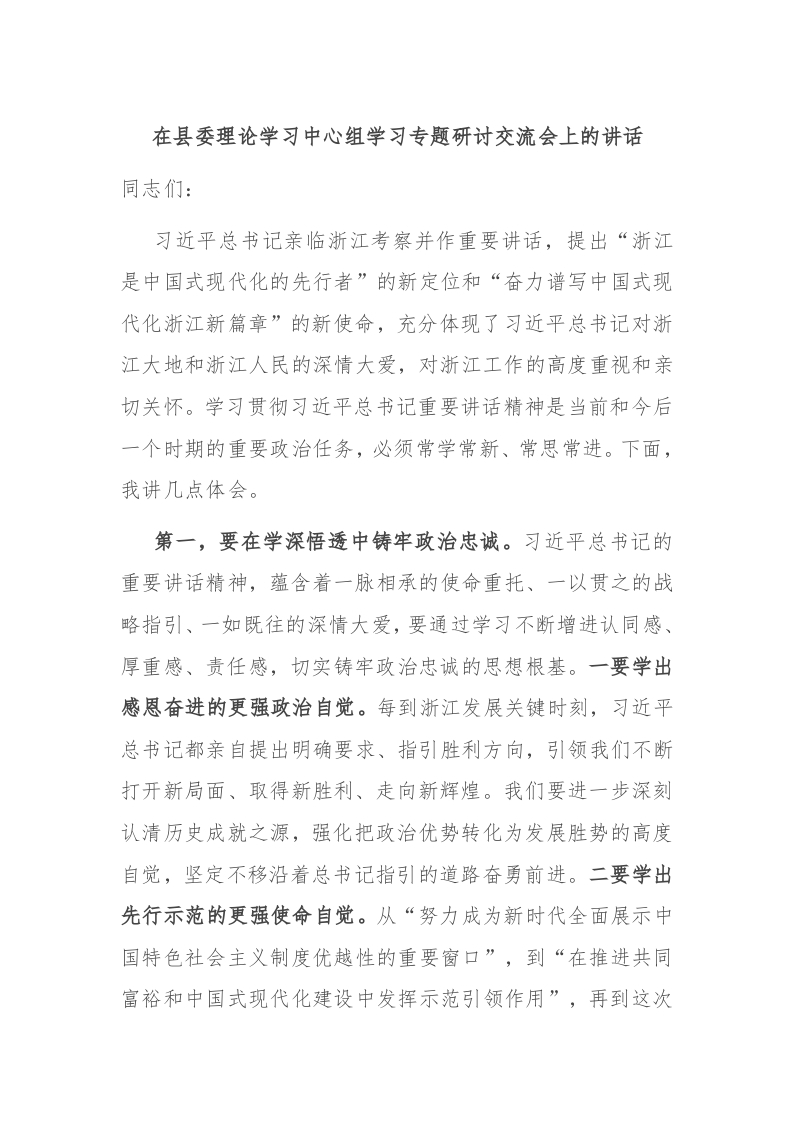 / 在县委理论学习中心组学习专题研讨交流会上的讲话