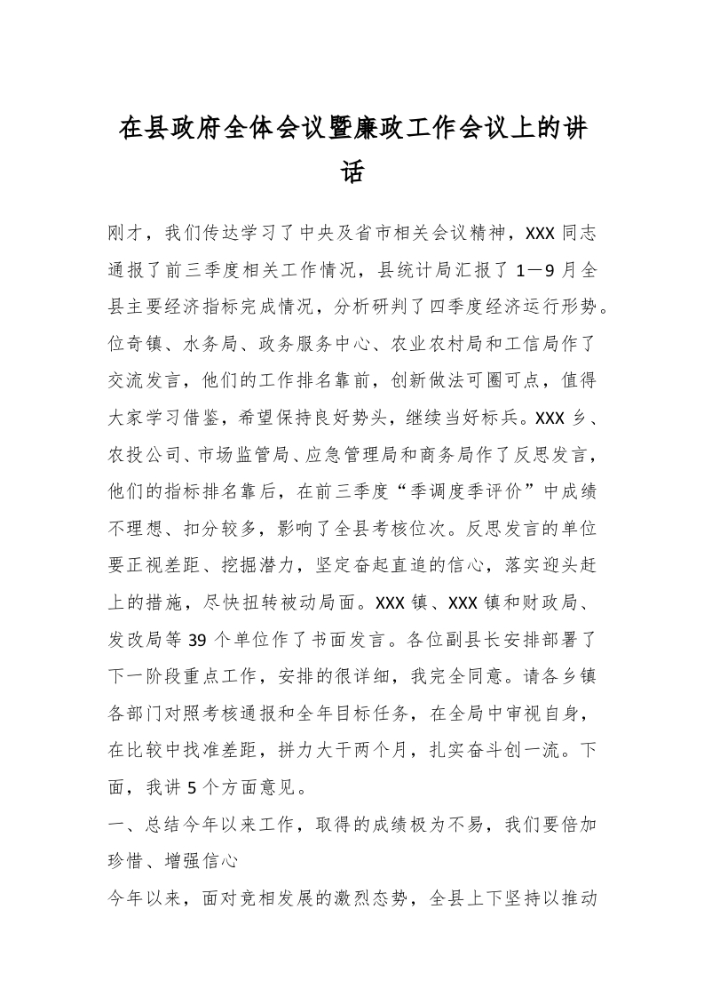 / 在县政府全体会议暨廉政工作会议上的讲话
