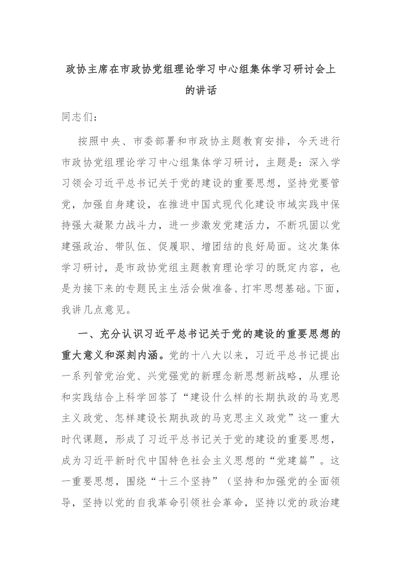 政协主席在市政协党组理论学习中心组集体学习研讨会上的讲话
