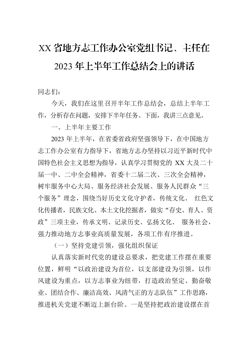 / XX省地方志工作办公室党组书记、主任在2023年上半年工作总结会上的讲话