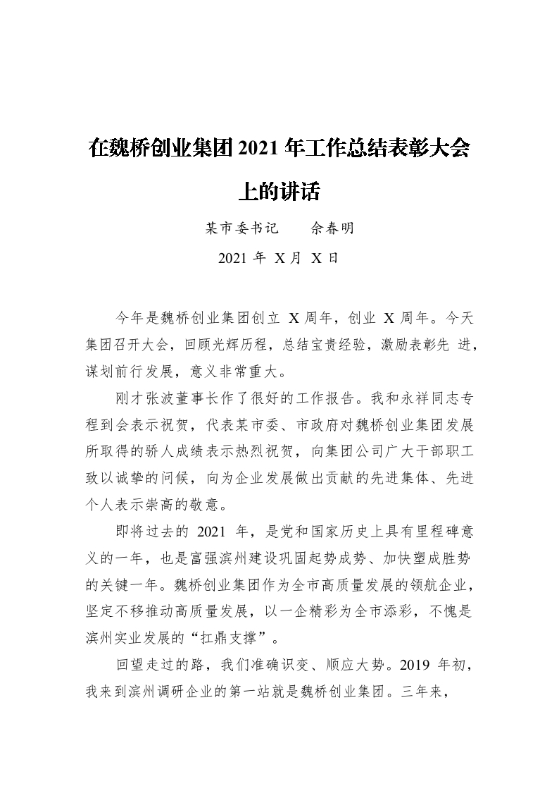 / 滨州市委书记佘春明:在魏桥创业集团年工作总结表彰大会上的讲话(20211230)