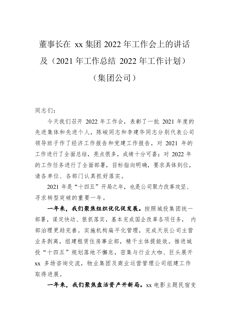 董事长:在xx集团2022年工作会上的讲话及(2021年工作总结2022年工作计划)(集团公司)