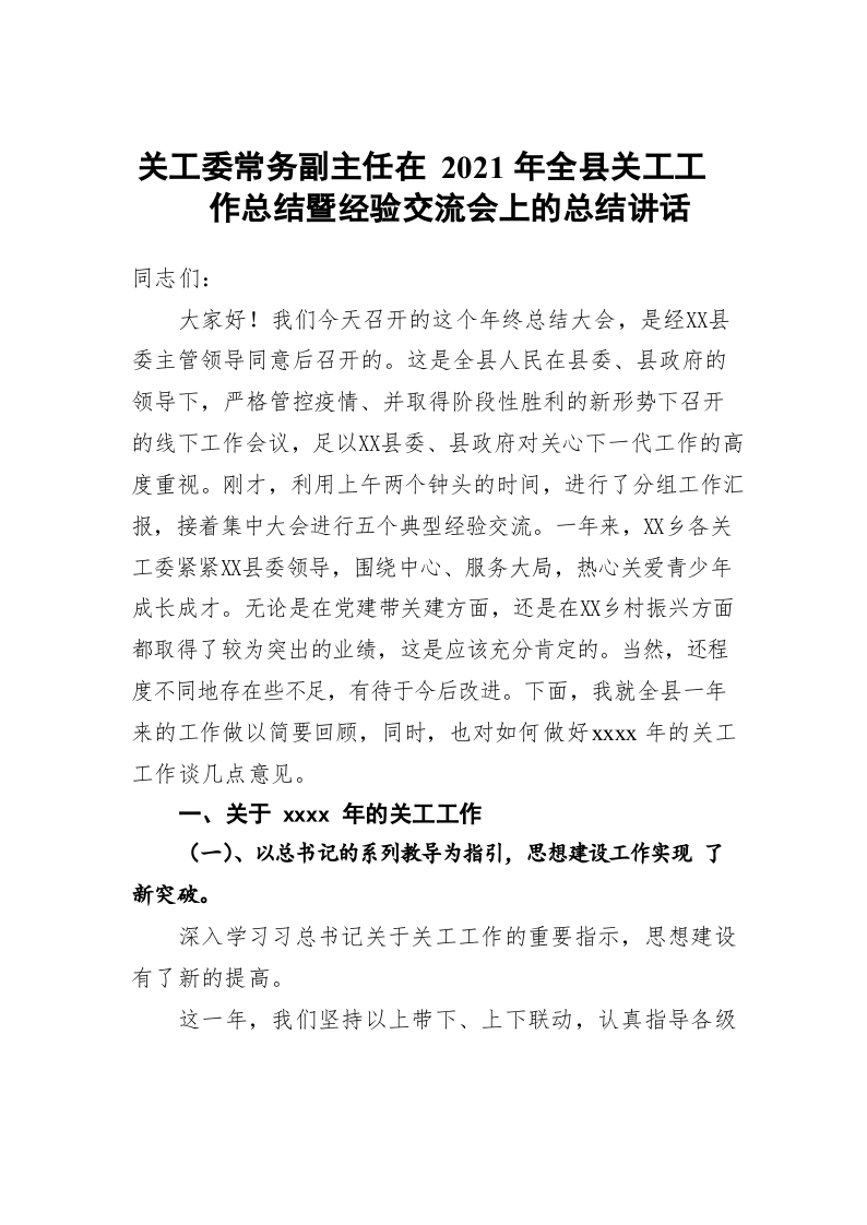 / 关工委常务副主任在2021年全县关工工作总结暨经验交流会上的总结讲话