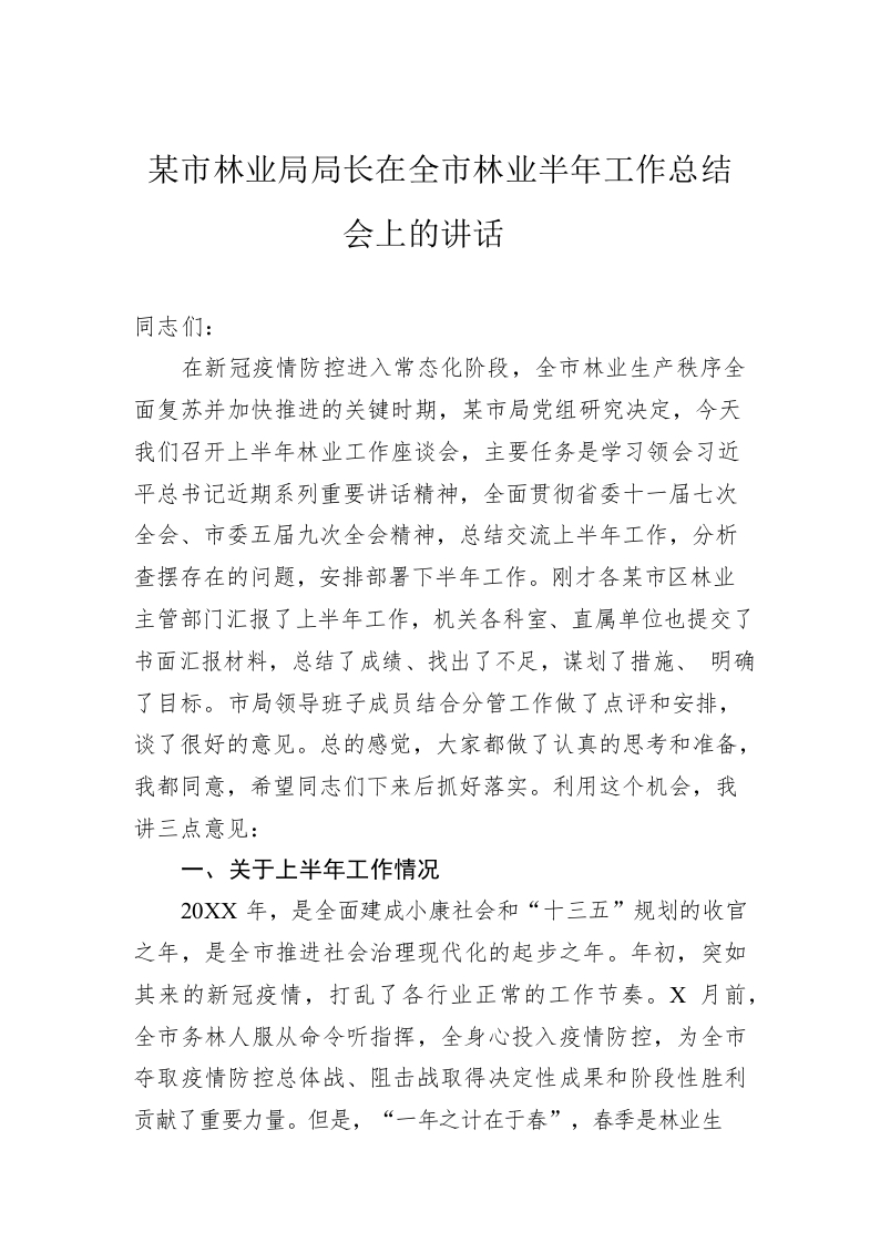 / 十堰市林业局局长在全市林业半年工作总结会上的讲话