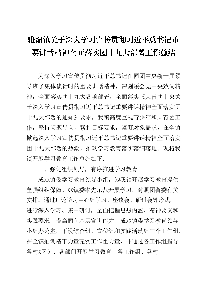 / 镇关于深入学习宣传贯彻习近平总书记重要讲话精神全面落实共青团十九大部署工作总结