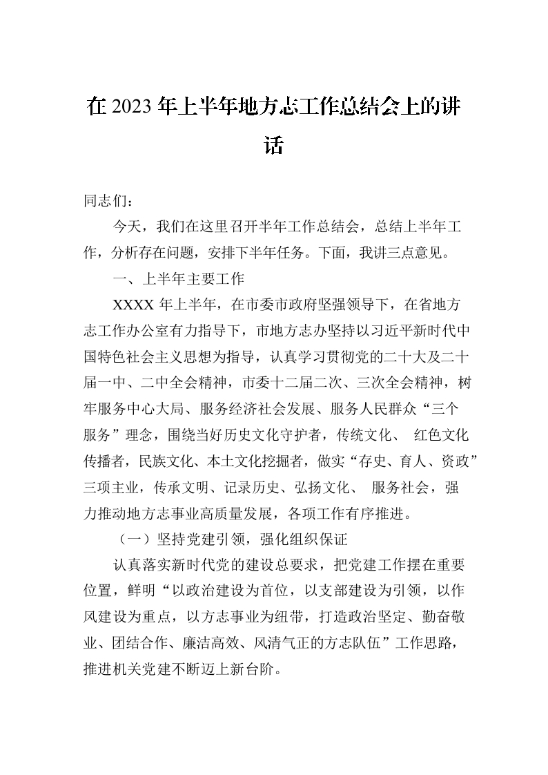/ 在2023年上半年地方志工作总结会上的讲话