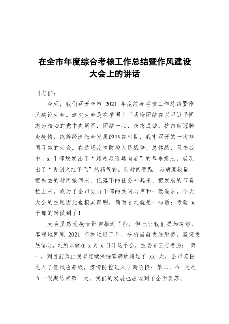 / 在全市年度综合考核工作总结暨作风建设大会上的讲话