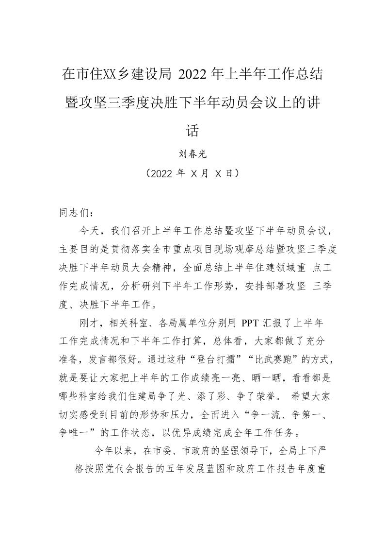/ 在市住房城乡建设局2022年上半年工作总结暨攻坚三季度决胜下半年动员会议上的讲话(20220813)