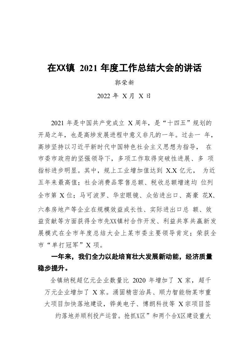 / 在镇2021年度工作总结大会的讲话(20220224)