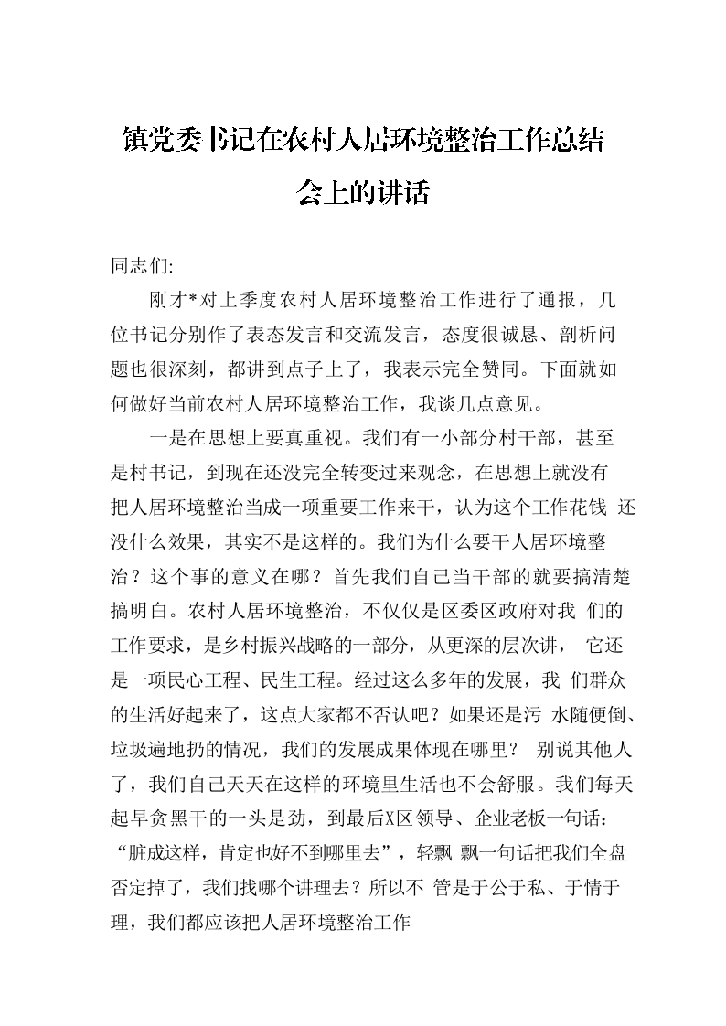 / 镇党委书记在农村人居环境整治工作总结会上的讲话