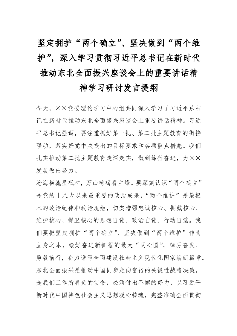 坚定拥护“两个确立”、坚决做到“两个维护”,深入学习贯彻习近平总书记在新时代推动东北全面振兴座谈会上的重要讲话精神学习研讨发言提纲