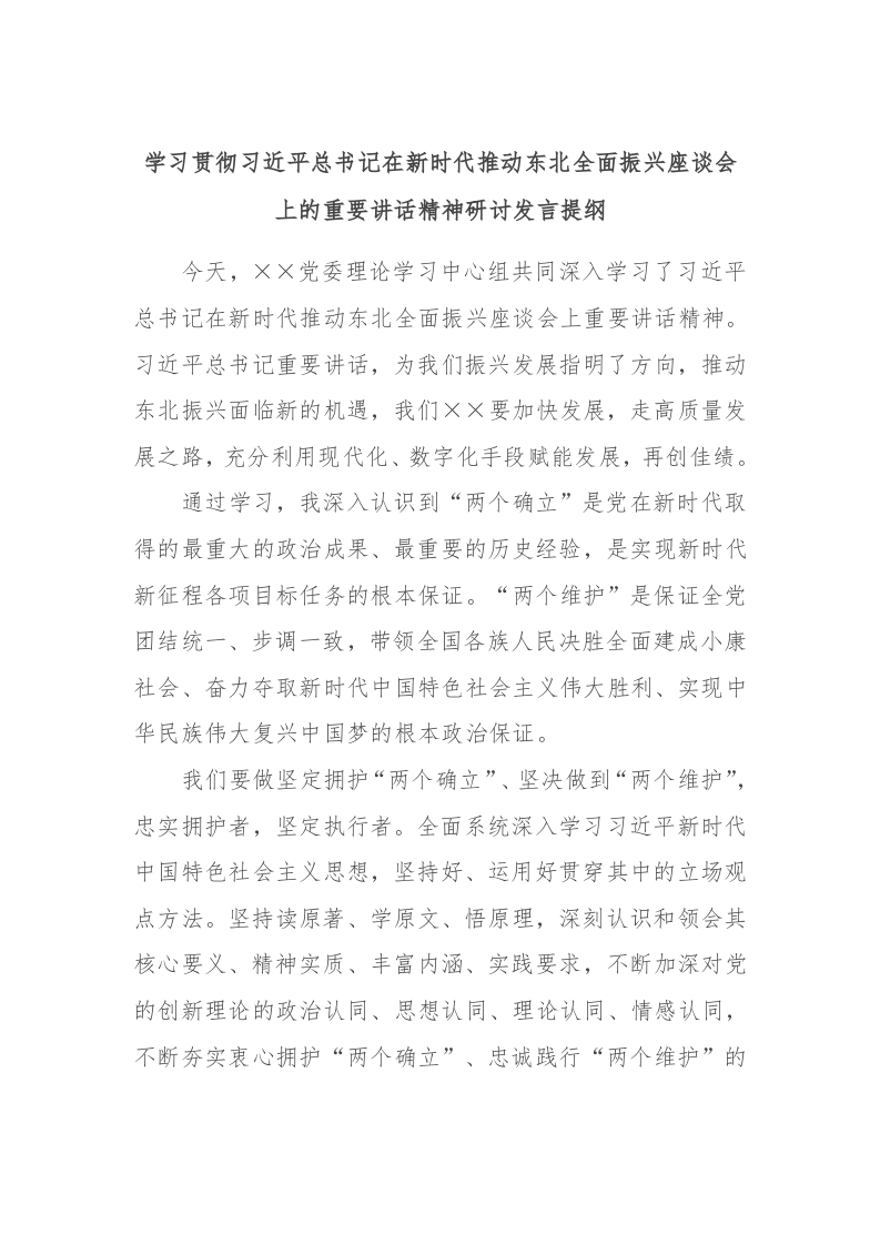 / 学习贯彻习近平总书记在新时代推动东北全面振兴座谈会上的重要讲话精神研讨发言提纲