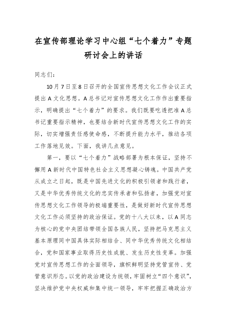 / 在宣传部理论学习中心组“七个着力”专题研讨会上的讲话