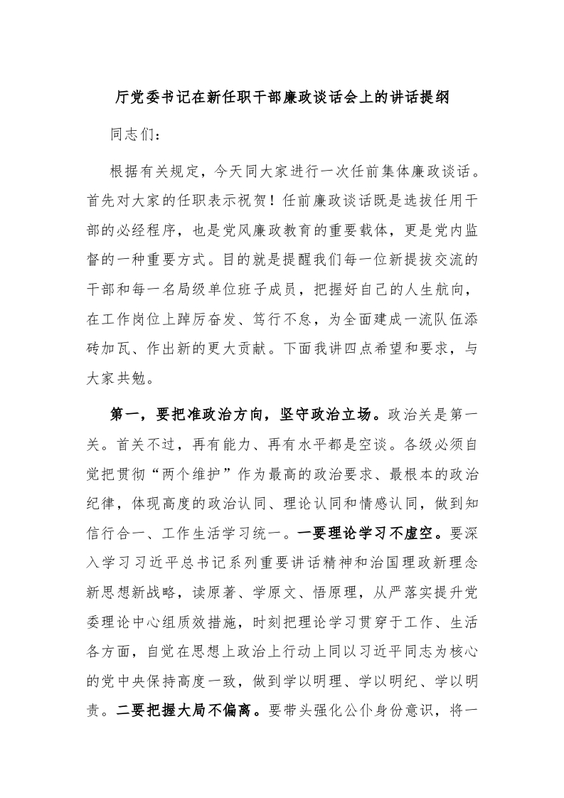 / 厅党委书记在新任职干部廉政谈话会上的讲话提纲
