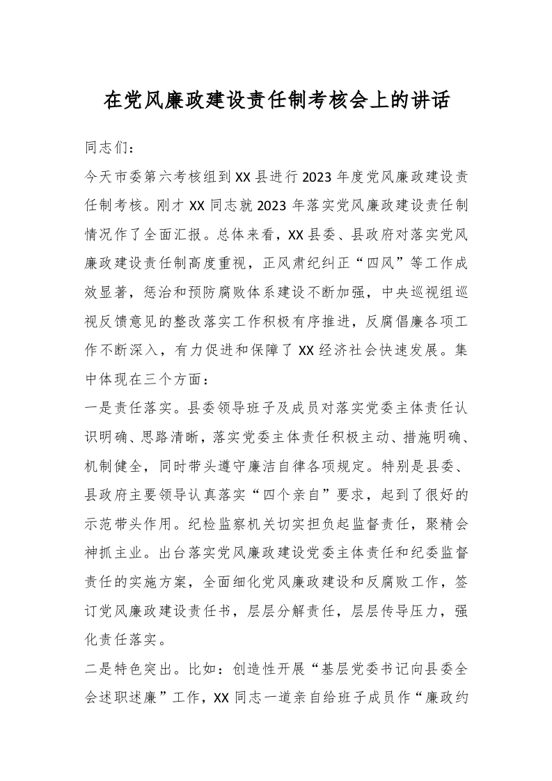 / 在党风廉政建设责任制考核会上的讲话