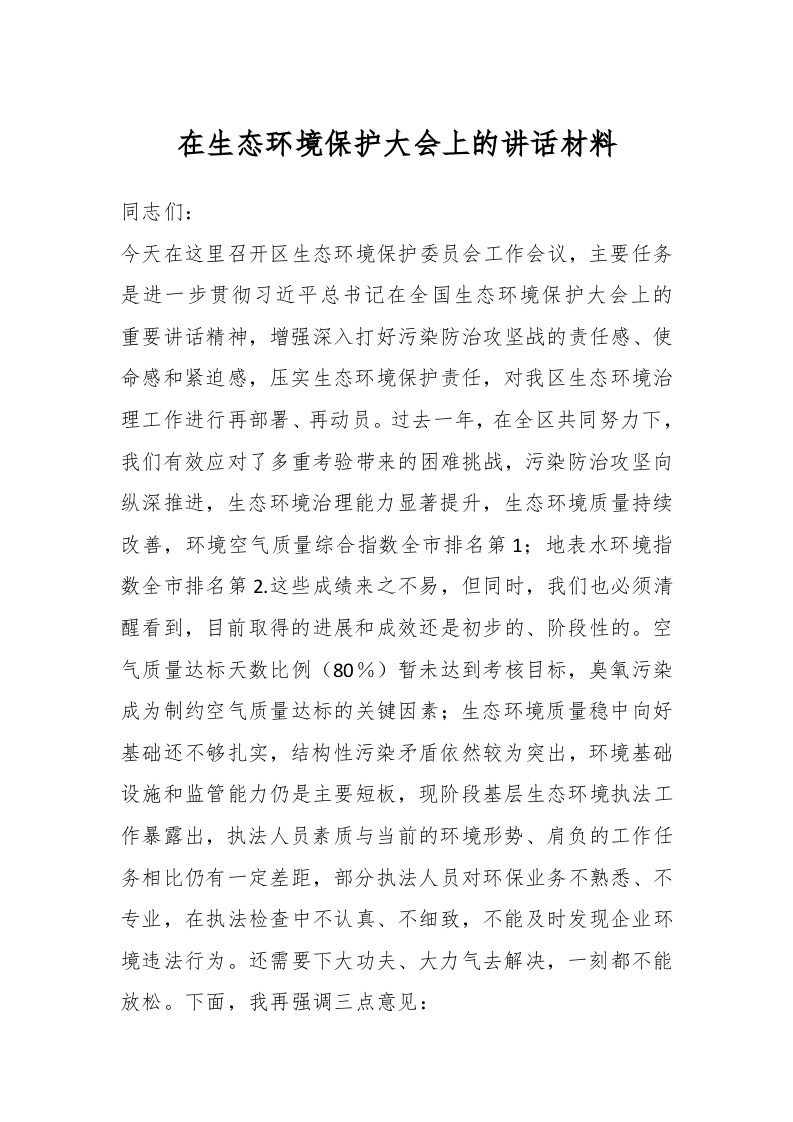 在生态环境保护大会上的讲话材料