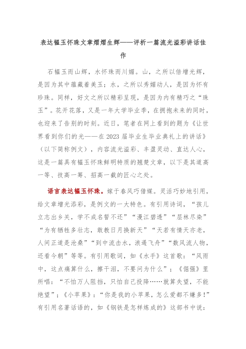/ 表达韫玉怀珠 文章熠熠生辉——评析一篇流光溢彩讲话佳作