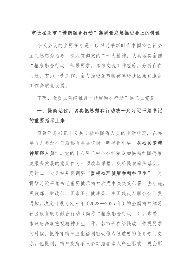 / 市长在全市“精康融合行动”高质量发展推进会上的讲话