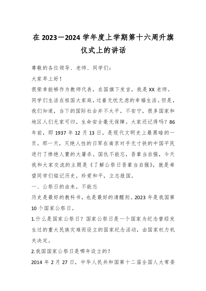 / 在2023-2024学年度上学期第十六周升旗仪式上的讲话
