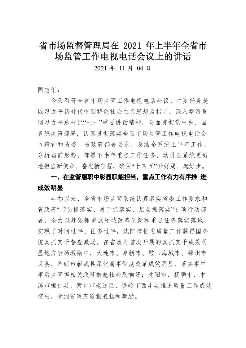 / (1.3)省市场监督管理局在2021年上半年全省市场监管工作电视电话会议上的讲话