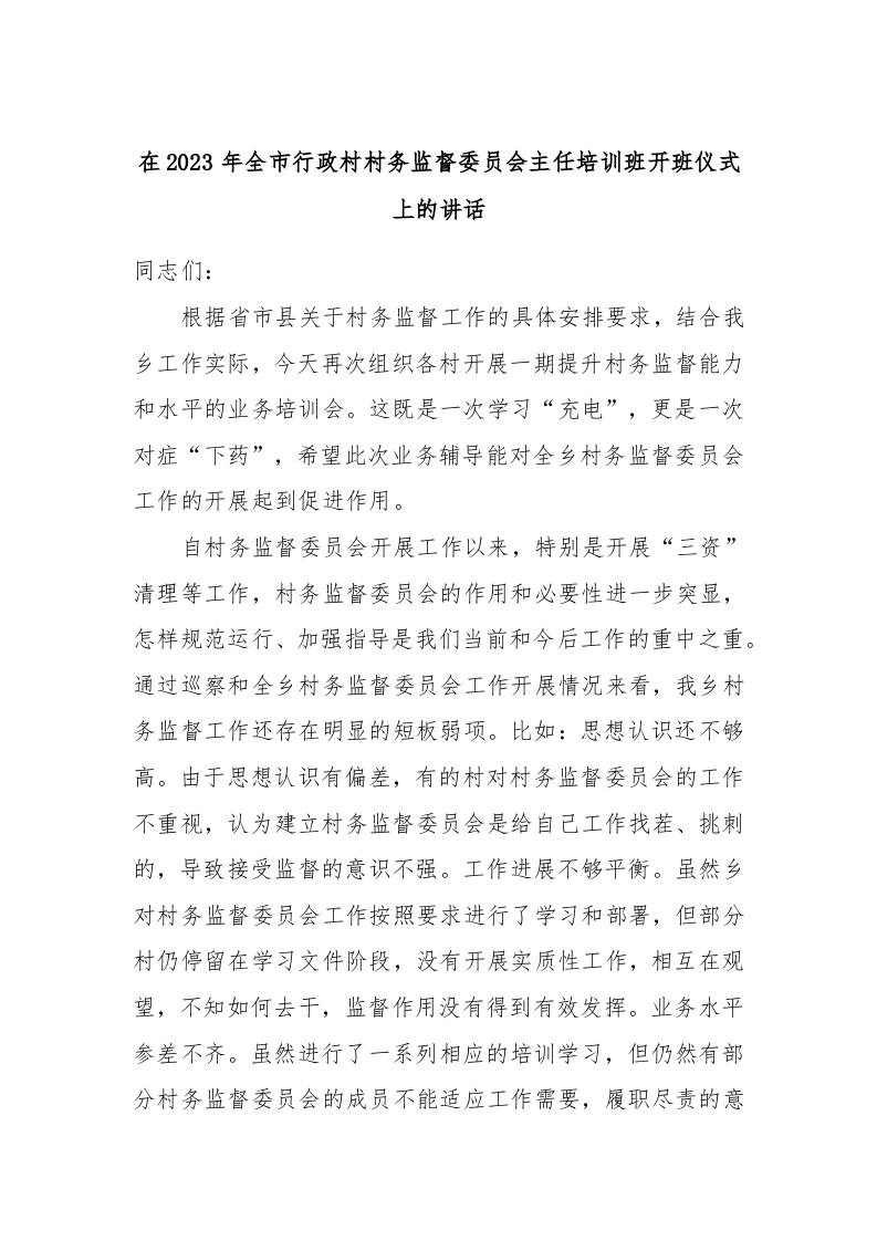 在2023年全市行政村村务监督委员会主任培训班开班仪式上的讲话