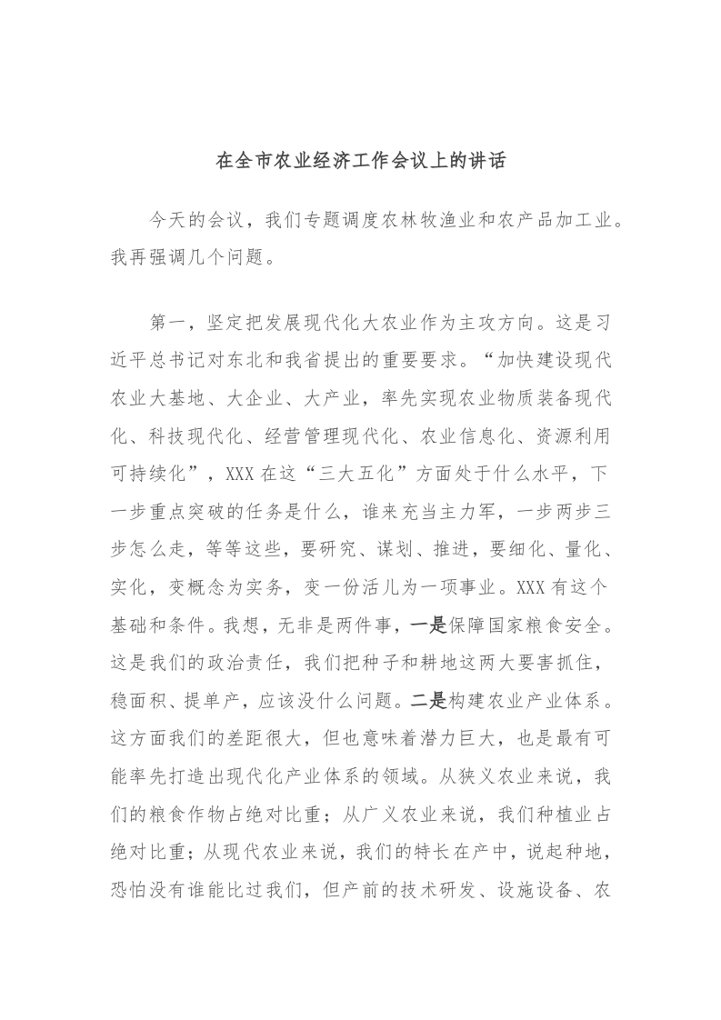 / 在全市农业经济工作会议上的讲话