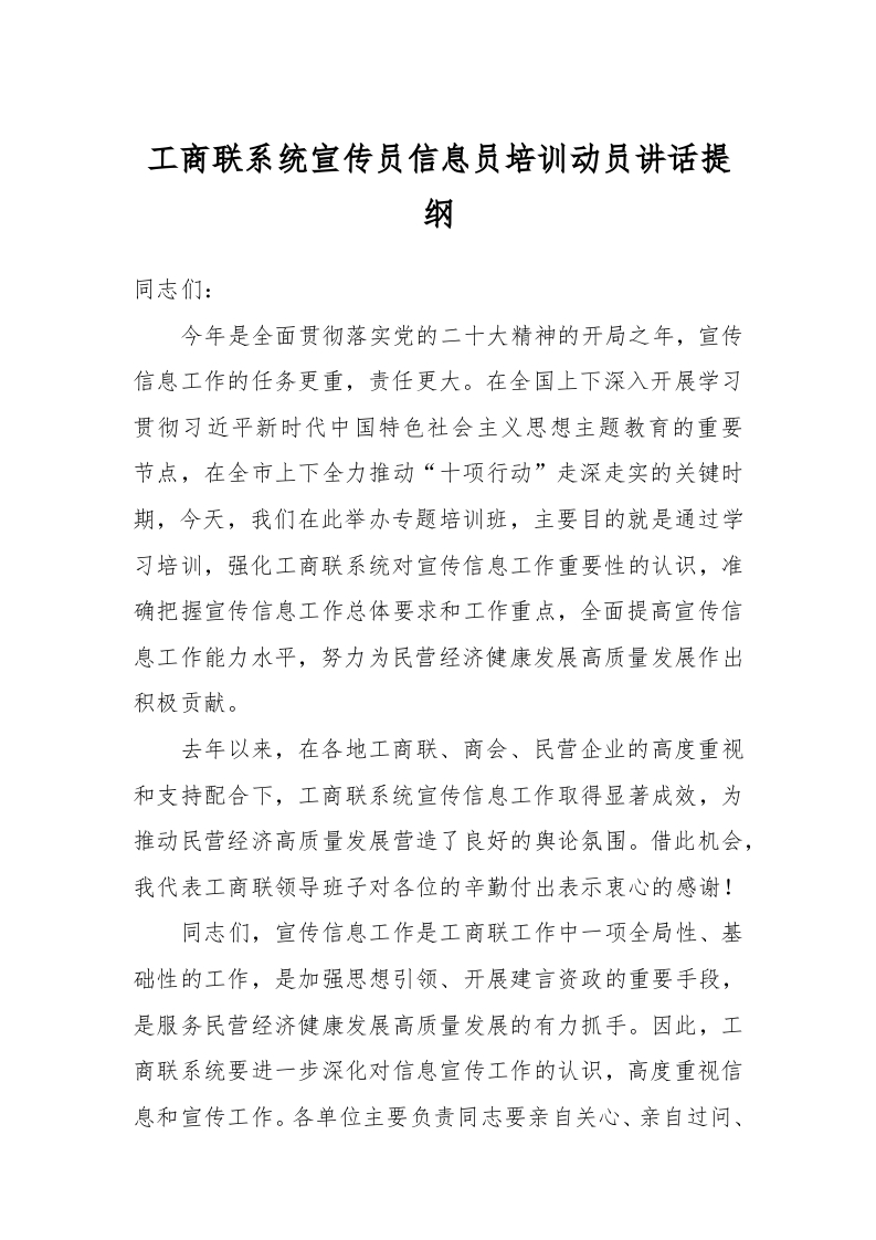 / 工商联系统宣传员信息员培训动员讲话提纲