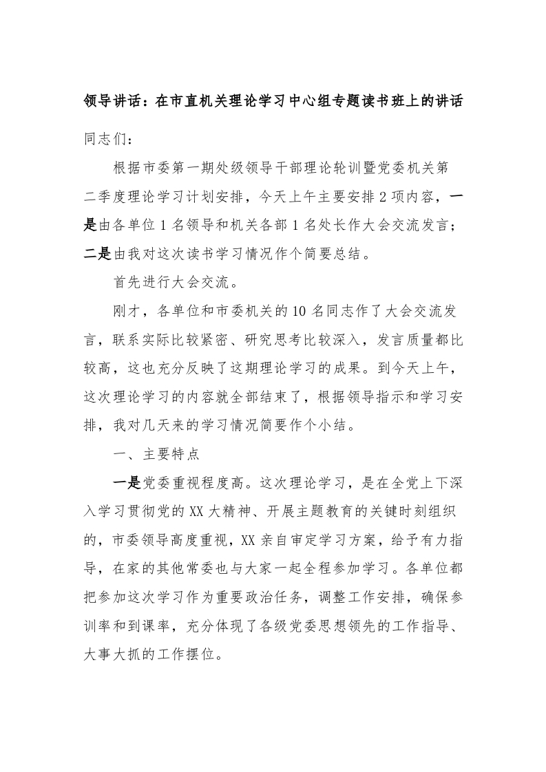 / 领导讲话:在市直机关理论学习中心组专题读书班上的讲话