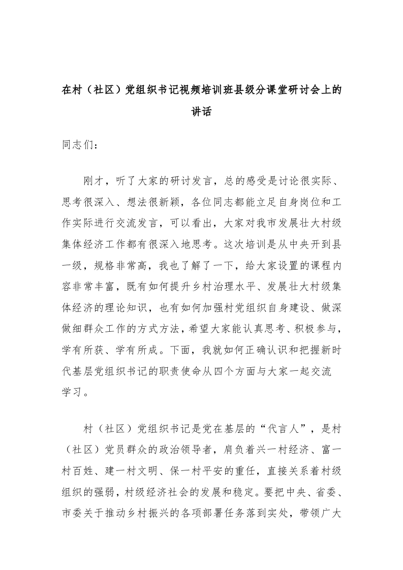 / 在村(社区)党组织书记视频培训班县级分课堂研讨会上的讲话