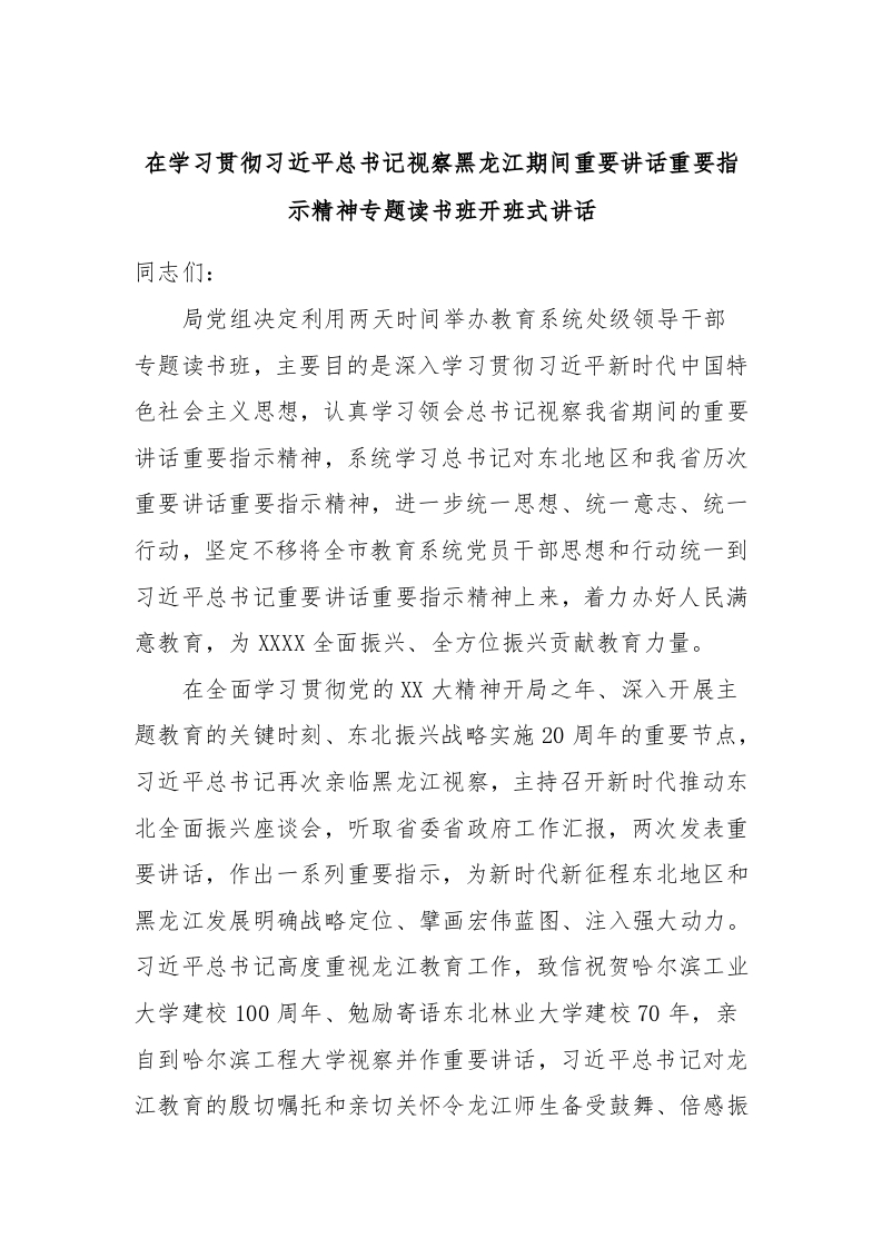 在学习贯彻习近平总书记视察黑龙江期间重要讲话重要指示精神专题读书班开班式讲话