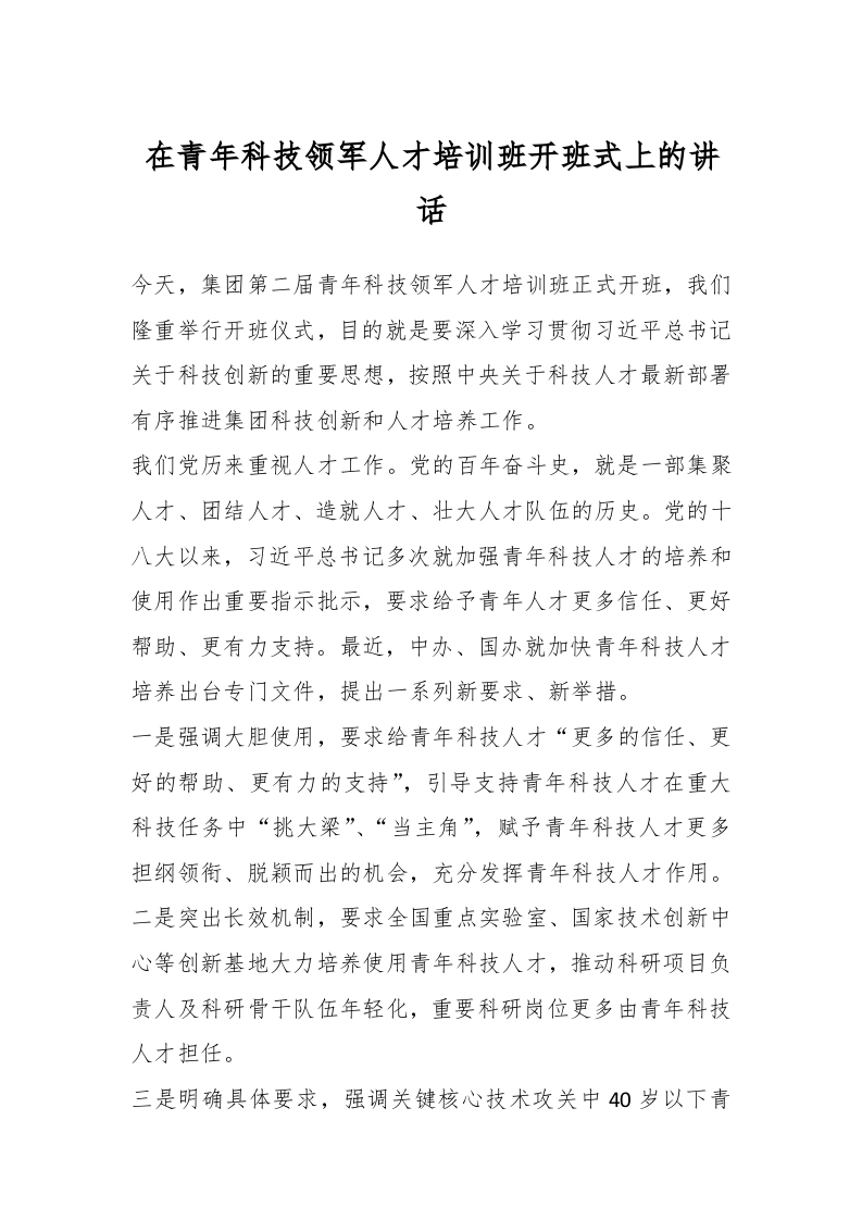 / 在青年科技领军人才培训班开班式上的讲话