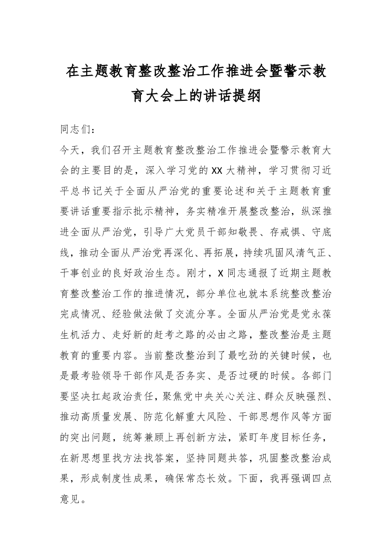 / 在主题教育整改整治工作推进会暨警示教育大会上的讲话提纲