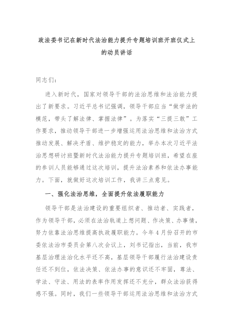 / 政法委书记在新时代法治能力提升专题培训班开班仪式上的动员讲话