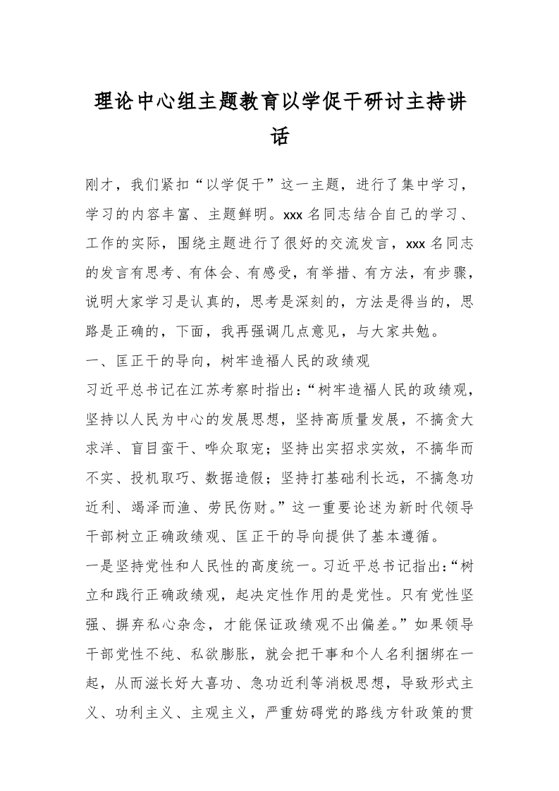 / 理论中心组主题教育以学促干研讨主持讲话