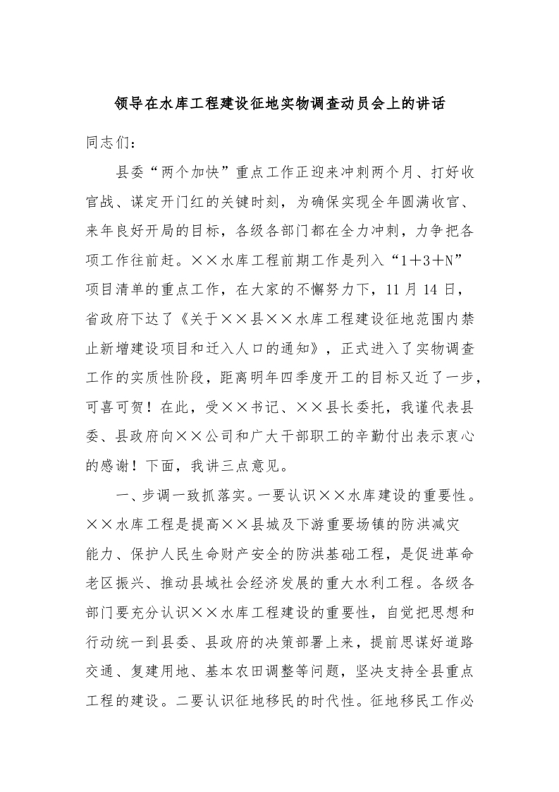 / 领导在水库工程建设征地实物调查动员会上的讲话