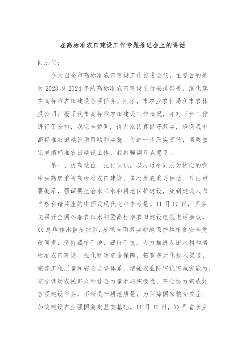 / 在高标准农田建设工作专题推进会上的讲话