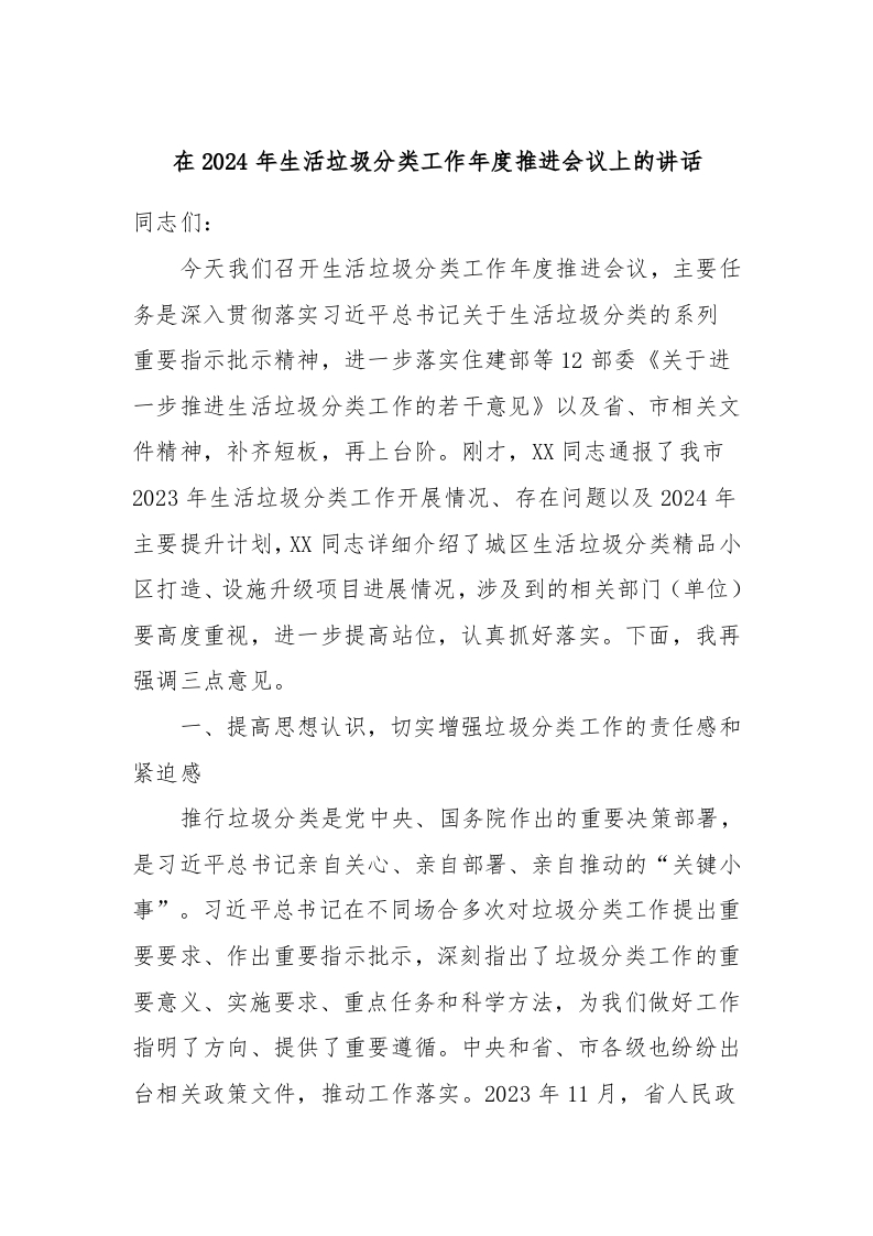 / 在2024年生活垃圾分类工作年度推进会议上的讲话