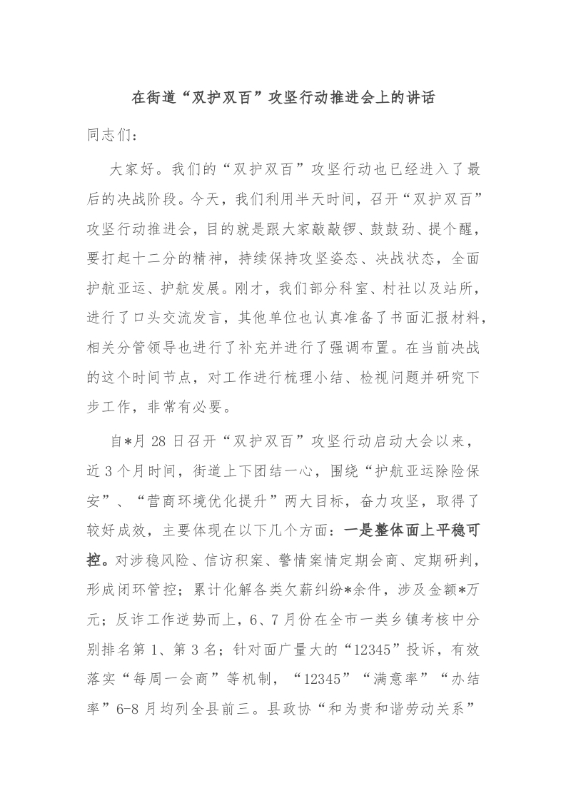 / 在街道“双护双百”攻坚行动推进会上的讲话