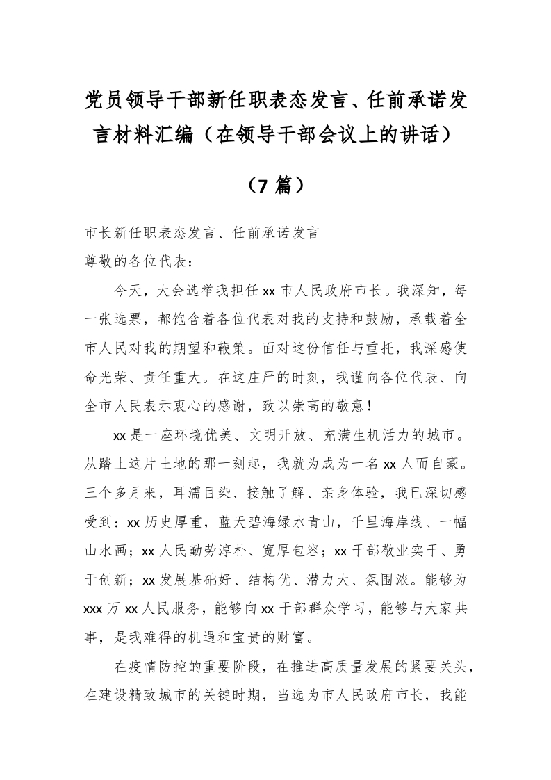 / (7篇)党员领导干部新任职表态发言、任前承诺发言材料汇编(在领导干部会议上的讲话)