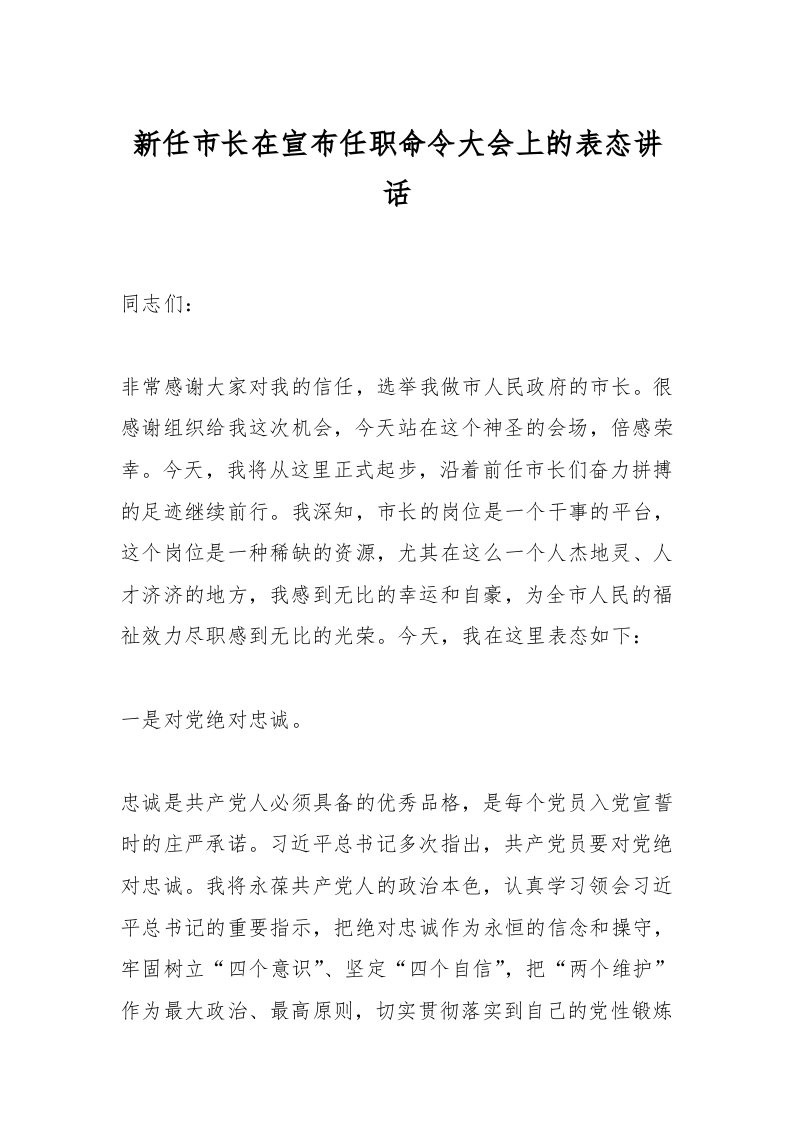 / 新任市长在宣布任职命令大会上的表态讲话