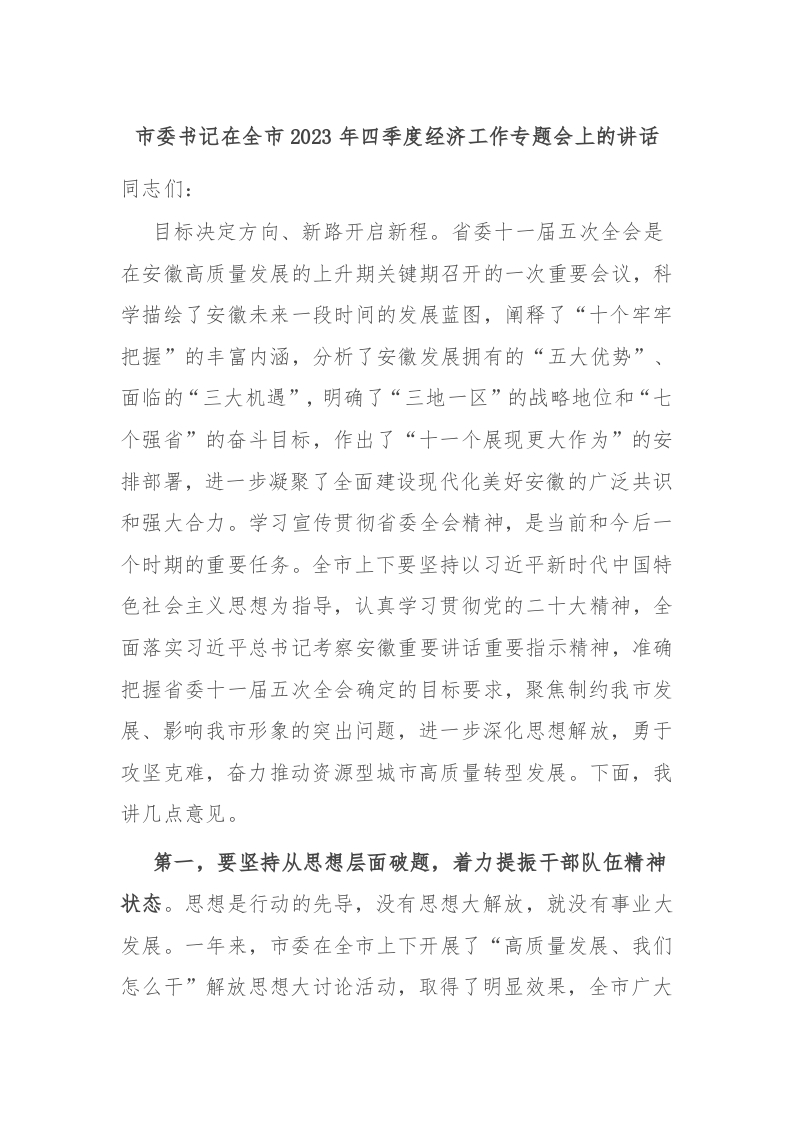 / 市委书记在全市2023年四季度经济工作专题会上的讲话