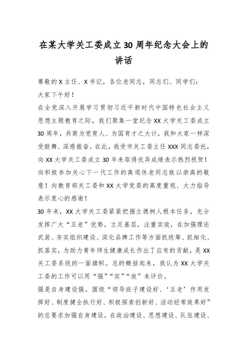/ 在某大学关工委成立30周年纪念大会上的讲话