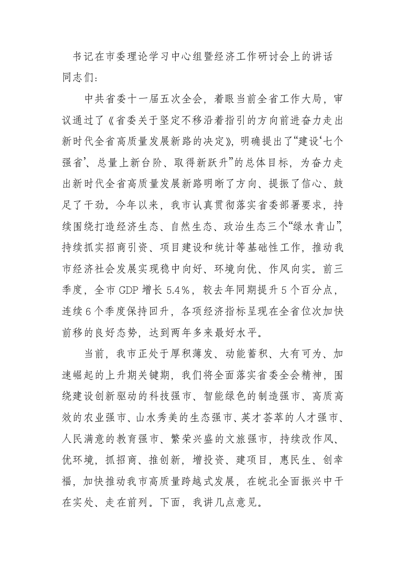 书记在市委理论学习中心组暨经济工作研讨会上的讲话
