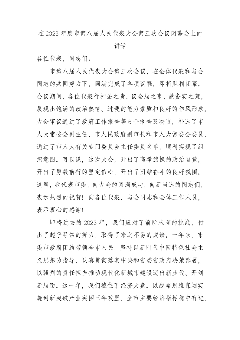 在2023年度市第八届人民代表大会第三次会议闭幕会上的讲话