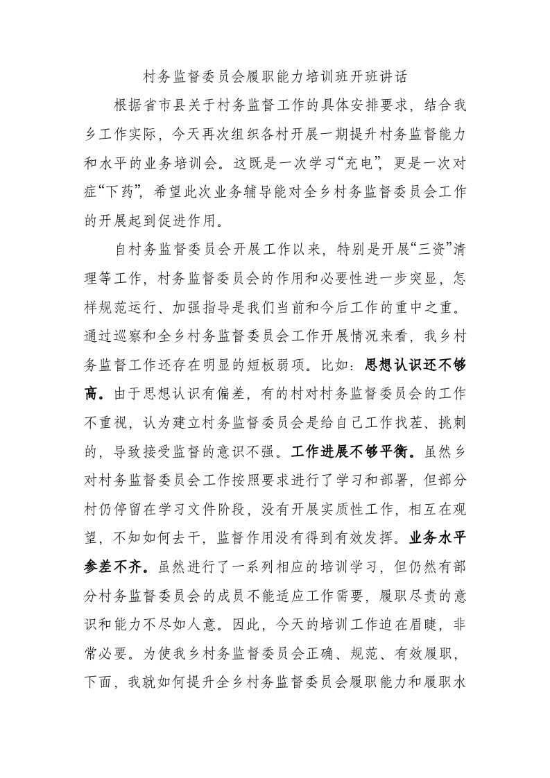 村务监督委员会履职能力培训班开班讲话