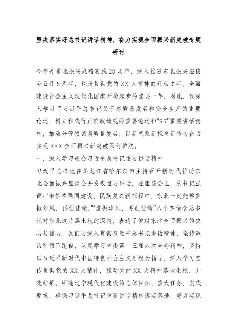 / 坚决落实好总书记讲话精神,奋力实现全面振兴新突破专题研讨
